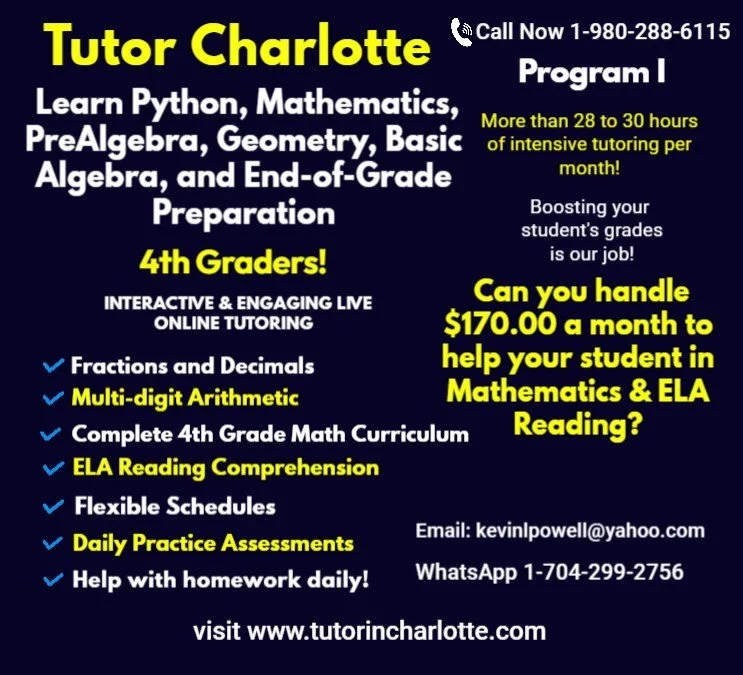 Tutor Charlotte Program I: Deep Mathematics & Language Arts Support Grades 4-8 Tutoring All Year Long Cost $170.00 per month!