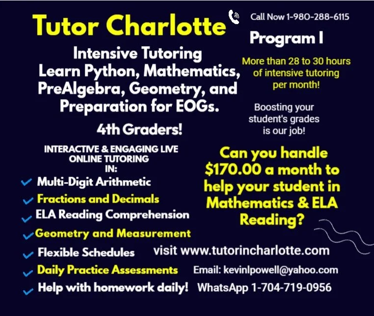 Tutor Charlotte Program I: Deep Mathematics & Language Arts Support Grades 4-8 Tutoring All Year Long Cost $170.00 per month!