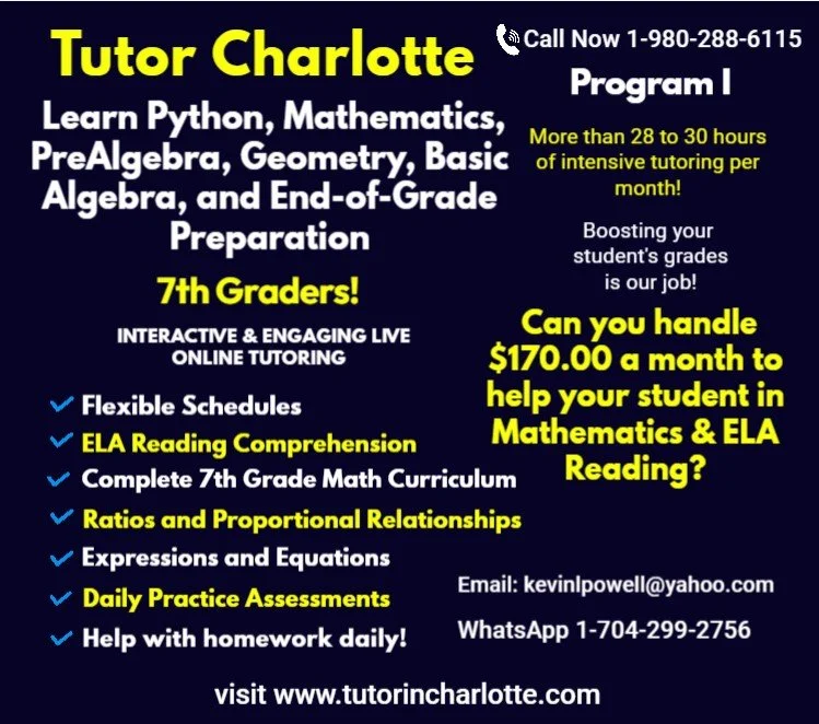 Class Size and Management: Seventh grade is often cited as a peak year for behavioral disruptions. Parents report that large class sizes (sometimes exceeding 30–35 students) make it difficult for teachers to provide the individual support needed for abstract concepts like rational number operations and linear equations. But Dr. Kevin L. Powell and Tutor Charlotte gives students 1 on 1 attention and focuses on your student’s individual learning needs.