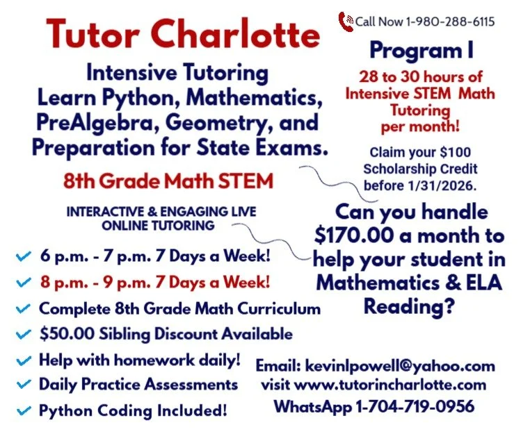 Tutor Charlotte Program I: Deep Mathematics & Language Arts Support Grade 8 Tutoring All Year Long Cost $170.00 per month!