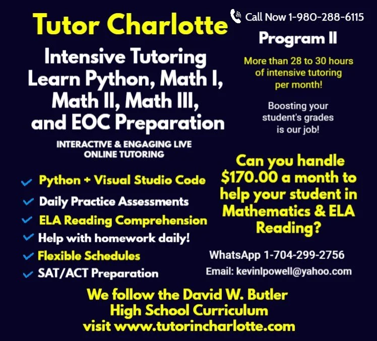 Tutor Charlotte Program II: Deep Mathematics & Language Arts + Tech Support Grades 9-12 Tutoring All Year Long Cost $170.00 per month!