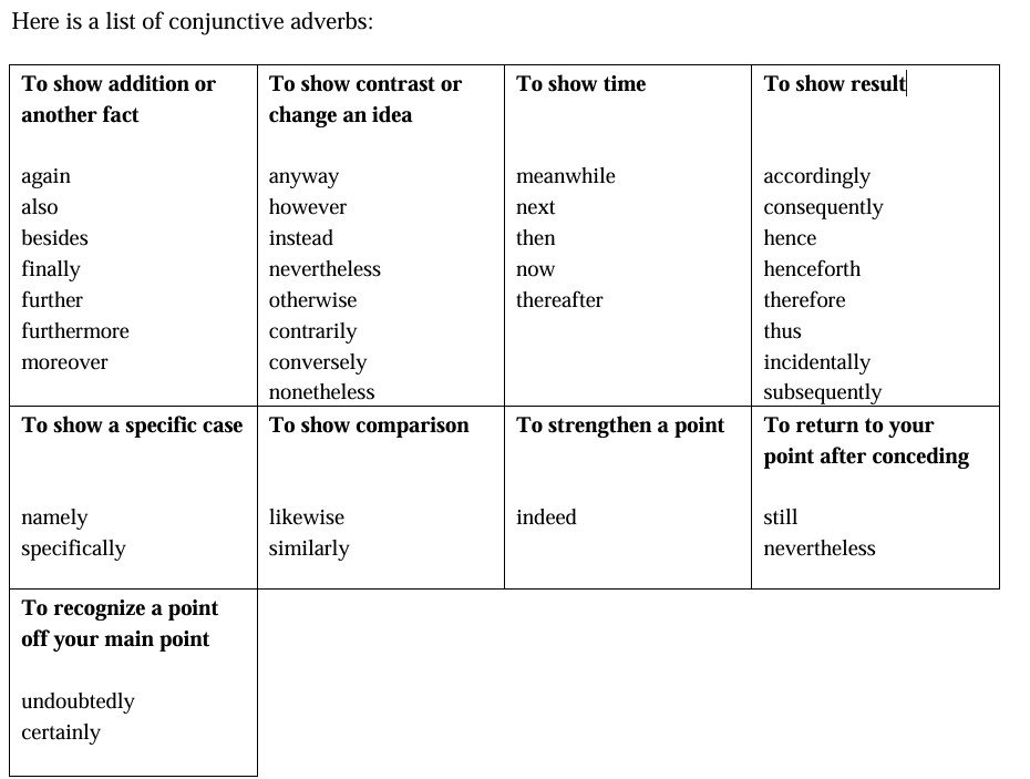 A conjunctive adverb connects phrases or independent clauses. It provides transitions between ideas and shows relationships.