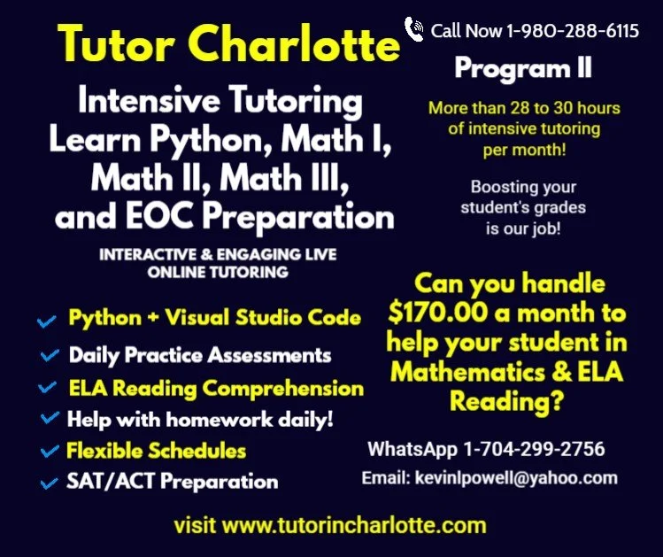 The Tutor Charlotte Program II: Deep Mathematics, Language Arts & Python Integration offers a rigorous academic foundation for high school students in grades 9–12. For $170.00 per month, students can receive more than 28 to 30 hours of intensive online tutoring a month seven days a week, following their specific school curriculum and standards.