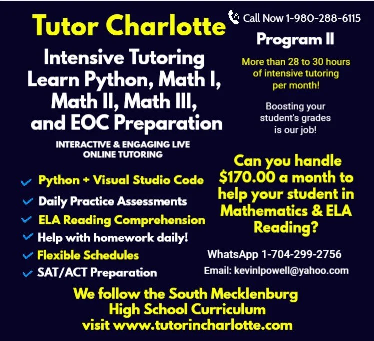 New for 2026 – Tech Literacy-The Next Gen Advantage: In today's competitive landscape, strong math skills are just the baseline. To truly excel in STEM careers, students need computational literacy. Tutor Charlotte is proud to launch our revolutionary Tech Literacy Advantage programs integrating Python Programming and Visual Studio Code directly into our proven academic support structure.