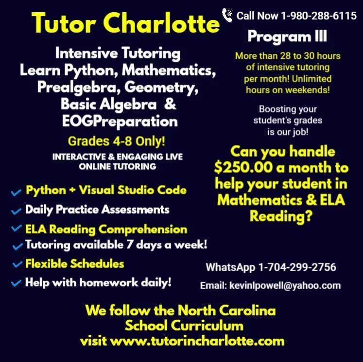 New for 2026 – Tech Literacy-The Next Gen Advantage: In today's competitive landscape, strong math skills are just the baseline. To truly excel in STEM careers, students need computational literacy. Tutor Charlotte is proud to launch our revolutionary Tech Literacy Advantage programs integrating Python Programming and Visual Studio Code directly into our proven academic support structure.