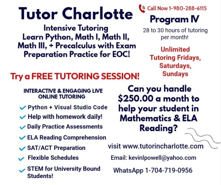 The Tutor Charlotte Program IV Unlimited Intensive Tutoring is an elite academic support system designed for high school students (Grades 9–12) to master complex subjects and excel in college entrance exams. For $250.00 per month, students receive expert instruction across advanced mathematics, language arts, and modern technical skills with a live master tutor, Dr. Kevin L. Powell.