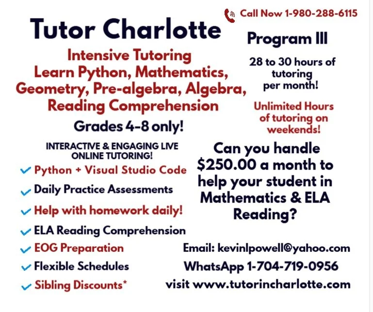 The Tutor Charlotte Program IV Unlimited Intensive Tutoring is an elite academic support system designed for high school students (Grades 9–12) to master complex subjects and excel in college entrance exams. For $250.00 per month, students receive expert instruction across advanced mathematics, language arts, and modern technical skills with a live master tutor, Dr. Kevin L. Powell.