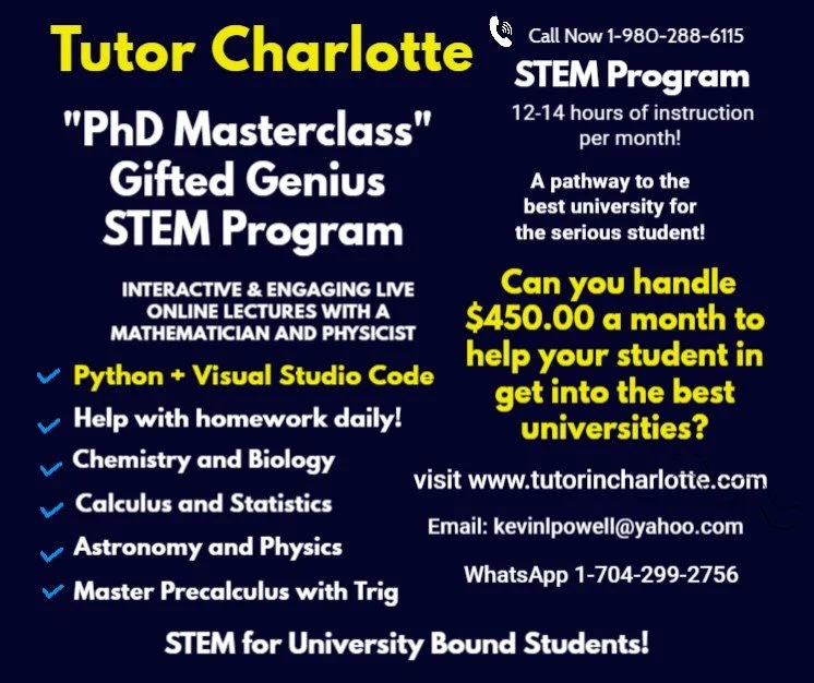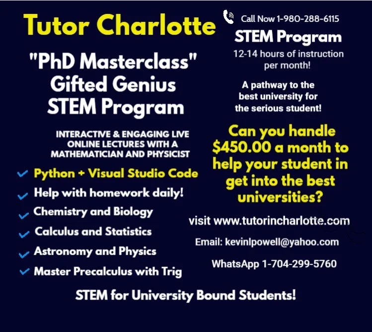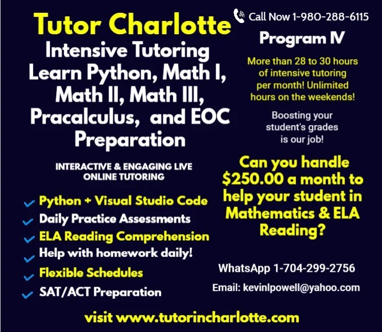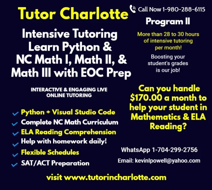 New for 2026 – Tech Literacy-The Next Gen Advantage: In today's competitive landscape, strong math skills are just the baseline. To truly excel in STEM careers, students need computational literacy. Tutor Charlotte is proud to launch our revolutionary Tech Literacy Advantage programs integrating Python Programming and Visual Studio Code directly into our proven academic support structure.