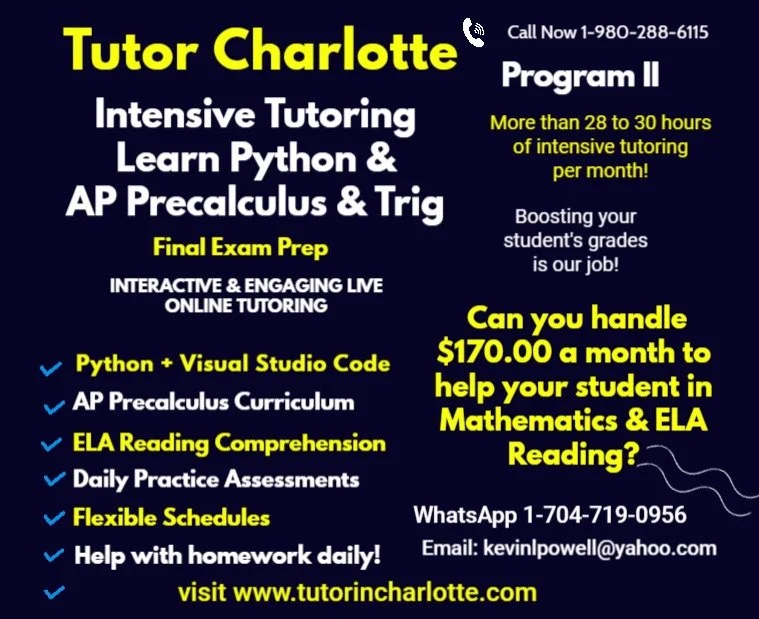 New for 2026 – Tech Literacy-The Next Gen Advantage: In today's competitive landscape, strong math skills are just the baseline. To truly excel in STEM careers, students need computational literacy. Tutor Charlotte is proud to launch our revolutionary Tech Literacy Advantage programs integrating Python Programming and Visual Studio Code directly into our proven academic support structure.