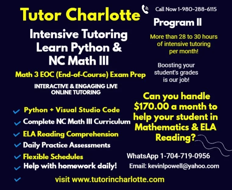 New for 2026 – Tech Literacy-The Next Gen Advantage: In today's competitive landscape, strong math skills are just the baseline. To truly excel in STEM careers, students need computational literacy. Tutor Charlotte is proud to launch our revolutionary Tech Literacy Advantage programs integrating Python Programming and Visual Studio Code directly into our proven academic support structure.